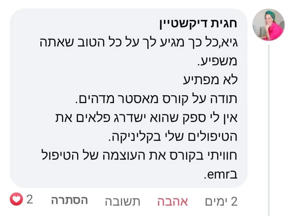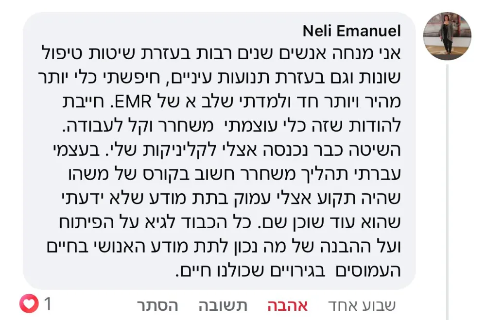 עבור המטפלים, היא מביאה עומק שלא היה להם, מחדדת את האינטואיציה, ועוזרת להם לבנות קליניקה עם יותר תוצאות, יותר דיוק, ויותר לקוחות שנשארים לאורך זמן.
