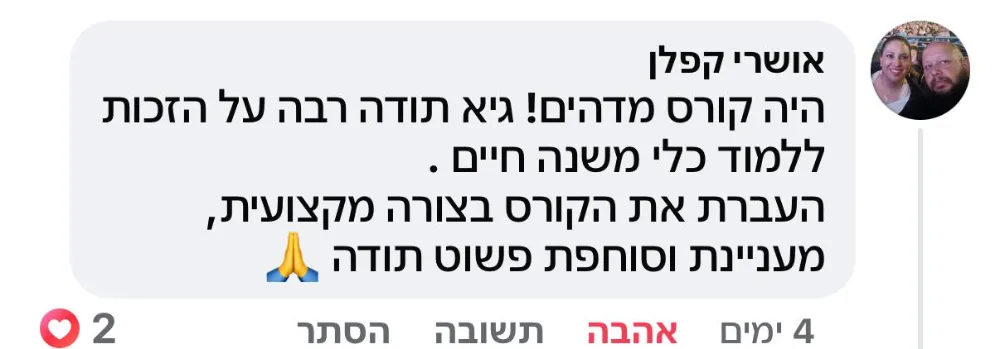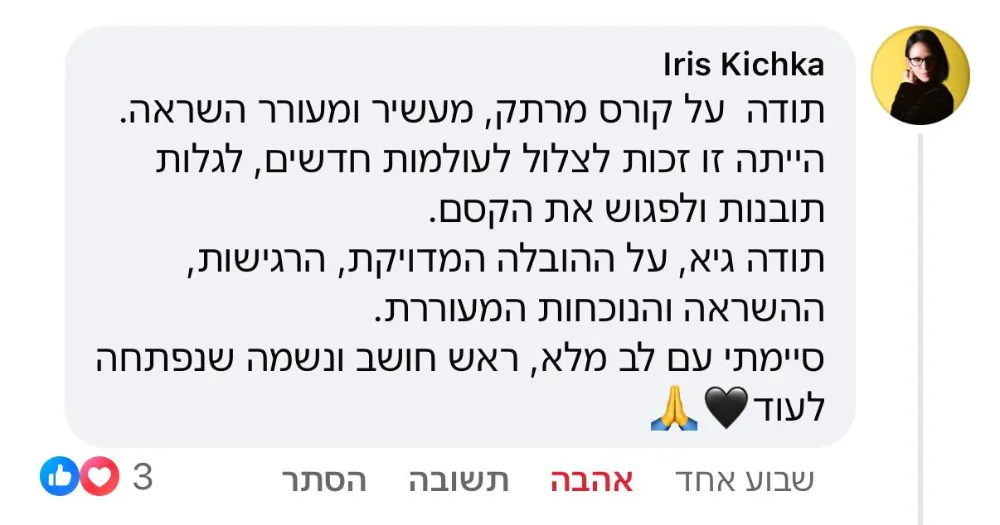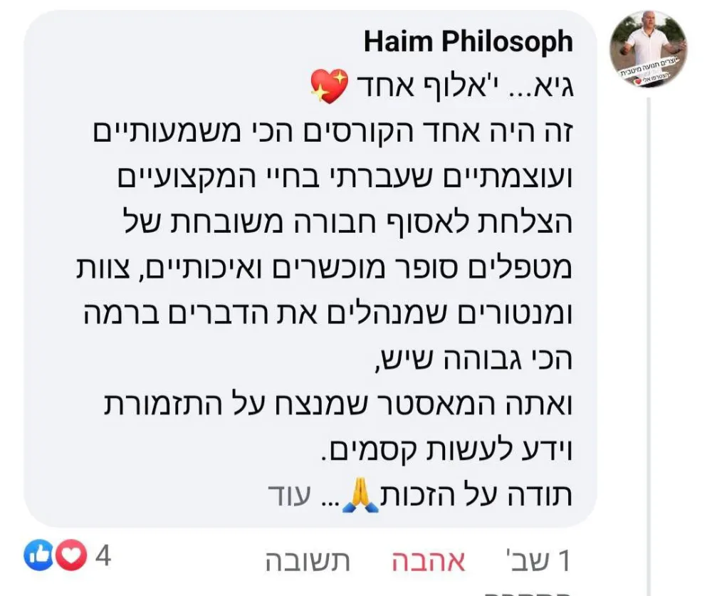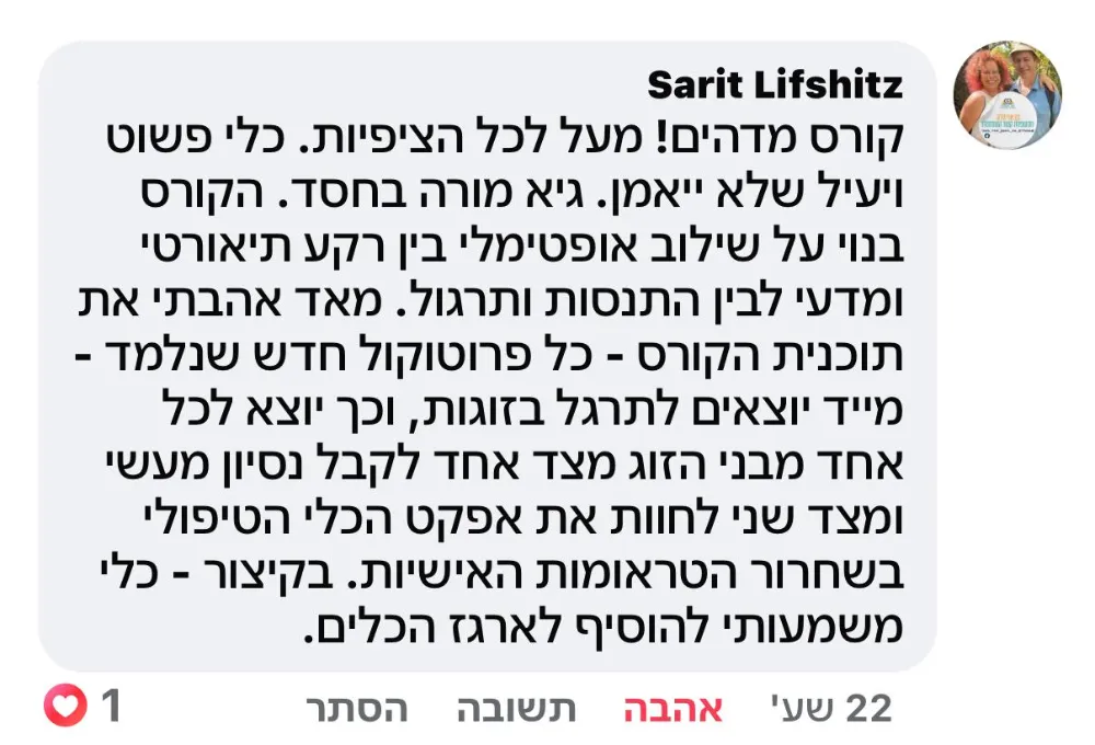 כל מפגש משלב תרגול אמיתי, צפייה חיה, ויישום מיידי של הכלים, לא רק תאוריה באוויר.